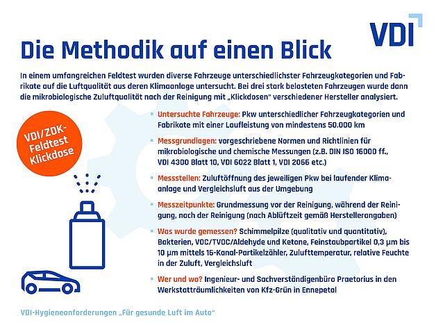 Dazu haben wir uns des Problems "Klimaanlage im Auto" angenommen. Die Richtlinie VDI/ZDK 6032 Blatt 1 „Lufttechnik; Luftqualität in Fahrzeugen; Hygieneanforderungen an die Lüftungstechnik; Pkw/Lkw“ geht dabei über eine Beschreibung des gewünschten Ist-Zustand hinaus und erklärt, welche Anforderungen erfüllt sein müssen, um gesunde Luft im Auto kontinuierlich sicherzustellen.
