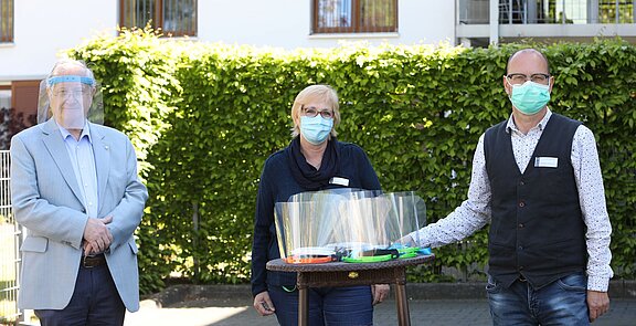 Jetzt übergab der VDI-Vertreter in Bielefeld-Quelle je zehn Gesichtsschilde an die ambulanten Pflegedienste Bonitas und Bethel-ambulant sowie 20 Gesichtsschilde mit blauen, grünen, orangefarbenen und weißen Bügeln an das Pflegezentrum Quelle der von Bodelschwinghschen Stiftungen Bethel. Als „hohe Wertschätzung der Pflegekräfte“ bezeichneten Hausleiter Michael Pergande und Pflegedienstleiterin Anke Sielemann die Spende. „In unserem Pflegezentrum sind rund 60 Fachkräfte im Einsatz für 80 hilfe- und pflegebedürftige Menschen, ein Viertel davon lebt im Demenzbereich“, so Pergande, „wir sind bereits mit Kittel, Mund-Nasen-Schutzmasken, Handschuhen und Desinfektionsmittel ausgestattet, bei Verdachtsfällen können wir jetzt zusätzlich die Gesichtsschilde nutzen.“ Die Pflegedienstleiterin dankte im Namen des Teams: „Derzeit sind wir neben der Pflege oft auch als einzige Bezugspersonen besonders gefragt, deshalb ist diese Spende eine tolle Geste.“ Die Schilde ließen sich leicht befestigen, gut reinigen und desinfizieren. Bislang habe man im Hause nur Verdachtsfälle auf eine Corona-Infektion gehabt, aber noch keinen bestätigten Fall. Nun hoffen alle darauf, dass die 20 Gesichtsschilde gar nicht erst zum präventiven Einsatz kommen müssen...