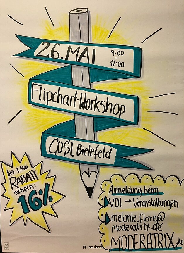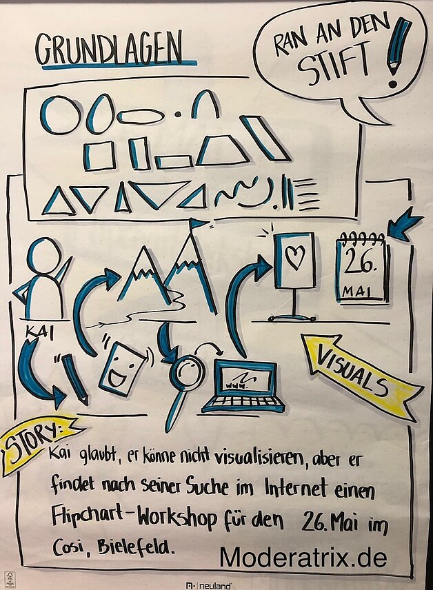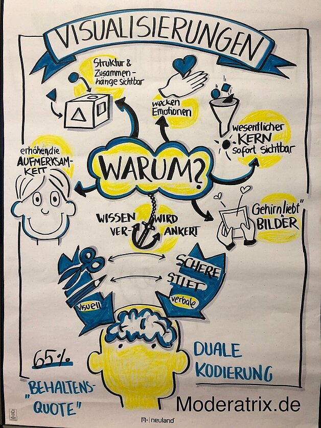 In diesem kostenfreien Online-Impulsvortrag gab Melanie Flore einen Ein- und Überblick zu den Möglichkeiten der Flipchart-Visualisierung und des Sketch-Notings. Dabei standen die Fragen im Mittelpunkt, was unter "dualer Codierung" zu verstehen ist, inwiefern die Visualisiserung die eigene Veranstaltung bereichert und wie einfach es ist, den Stift selbst in die Hand zu nehmen.