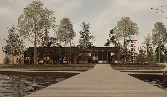 Aufgeteilt auf drei Baukörper, die sich als Ensemble zum Ostsee ausrichten, wirkt dieser Entwurf gleichermaßen traditionell und modern. Der Titel „Xylit“ ist inspiriert vom gleichnamigen Material, spielt an auf das faserige Wesen alter Baumstämme. Die mit geschwärztem Holz verkleideten Baukörper sind nachhaltig konzipiert, nehmen jedoch farblich und materiell Bezug auf den Charakter der Braunkohle. Der gelungene Kontrast zwischen hellen Innenräumen und schwarzem Baukörper ist sehr eindrücklich. Die Nutzung von Holz für Konstruktion und Fassade bewertete die Jury als positiv, die Verwendung regionaler Quellen würde die Nachhaltigkeit des Projekts weiter erhöhen.