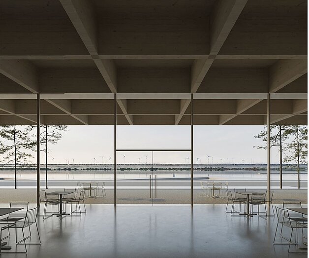 Das Dach des Museums entwickelt sich zum Hochpunkt in Richtung nordöstlicher Ecke dieses ausgesprochen smart und elegant sich zeigenden Gebäudes. Er weist in Richtung See, wo Besuchende den Raum in voller Höhe wahrnehmen können. Der Innenraum spielt mit offenen, erhöhten und helleren Bereichen, die engen, sich schließenden, dunkleren Zonen gegenüberstehen.