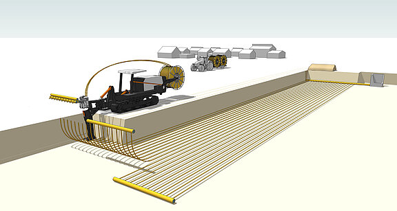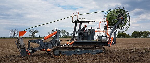 Professor Thomas Herlitzius, im VDI ehrenamtlich tätig als Leiter des Arbeitskreises Agrarsystemtechnik (Dresdner Bezirksverein) der Max-Eyth-Gesellschaft Agrartechnik, erforscht und erprobt seit 2008 mit seinem Institut die Umsetzung des Technologiekonzepts zur Agrothermienutzung. Da der Markt weltweit keine geeigneten Pflüge oder Fräsen zum Verlegen der Kollektorrohre anbietet, hat sich Herlitzius zu einer Eigenentwicklung entschlossen und arbeitet dazu mit der Doppelacker GmbH zusammen. „Das aktuell eingesetzte Maschinensystem, der sogenannte Kollektorweber, bringt die Flächenkollektoren so in den Ackerboden ein, dass sie mit zwei Metern weit unterhalb der Wurzeltiefe einschlägiger Kulturpflanzen liegen. Damit ist sichergestellt, dass es nicht zu Kollisionen mit anderen, landwirtschaftlichen Bodenbearbeitungsmaschinen kommt und landwirtschaftliche Nutzung direkt nach Verlegung ungehindert fortgesetzt werden kann,“ erläutert Herlitzius das Verfahren.
