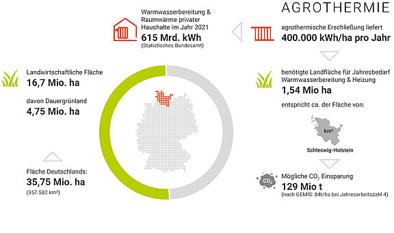Im Vergleich zu kleinen Grundstücken von Einfamilienhäusern erlauben es landwirtschaftliche Nutzflächen, wesentlich größere Kollektoranlagen zu errichten und könnten damit einen entscheidenden Beitrag zur Wärme- und damit zur Energiewende leisten. Bei einem pauschalierten Ansatz der Wärmeentzugsleistung von 200 Kilowatt pro Hektar und 2.000 Vollbetriebsstunden pro Jahr liefert ein Hektar 400.000 Kilowattstunden thermische Energie. Das ersetzt 40.000 Liter Heizöl und spart circa 84 Tonnen Kohlendioxid im Jahr. Stände eine Erschließungsfläche etwa im Umfang von Schleswig-Holstein zur Verfügung, ließe sich damit - im Äquivalent - der bundesweite Bedarf an Raumheizung und Warmwasserbereitung aller privaten Haushalte decken.
