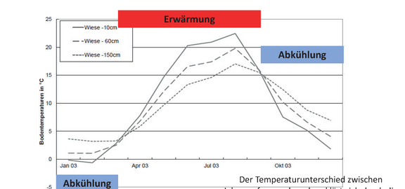 Wärmepumpen sind ein sehr effektives Mittel zur Wärmegewinnung, vor allem dann, wenn die Wärmequelle nahezu unerschöpflich ist wie Luft, fließendes Grundwasser oder Geothermie. Kritischer muss man oberflächennahe Wärmekollektoren im Boden sehen. Betrachtet man Strahlungs- und Energieflüsse im Klimasystem, wie sie in jedem Meteorologie- oder Klimatologiebuch enthalten sind, so vermisst man Angaben zum Boden. Ursache ist, dass der Boden sich im Sommerhalbjahr erwärmt und diese Wärme im Winter wieder an die Luft bzw. zur Verdunstung von Wasser abgibt. Es findet also kein Energiegewinn statt. Im Tagesgang erwärmt sich der Boden von Sonnenaufgang und Sonnenuntergang und danach kühlt er sich wieder ab. Da im Sommer in unseren Breiten bis zu 15 Stunden Sonnenschein sind, erwärmt sich der Boden besonders stark. Wegen der geringen Wärmeleitung des Bodens kommt diese Wärme in 10 m Tiefe aber erst im Winter an. Im Winter mit nur maximal 7 Std. Sonnenschein kühlt sich der Boden besonders stark ab, zumal der Einfallswinkel der Sonne gering ist und es häufig trüb ist. Somit haben wir eine Erwärmung des Bodens von Ende März bis Anfang September und eine Abkühlung im Winterhalbjahr. Dieser Sachbestand ist seit etwa 100 Jahren in den entsprechenden Fachbüchern und der Fachliteratur dokumentiert.