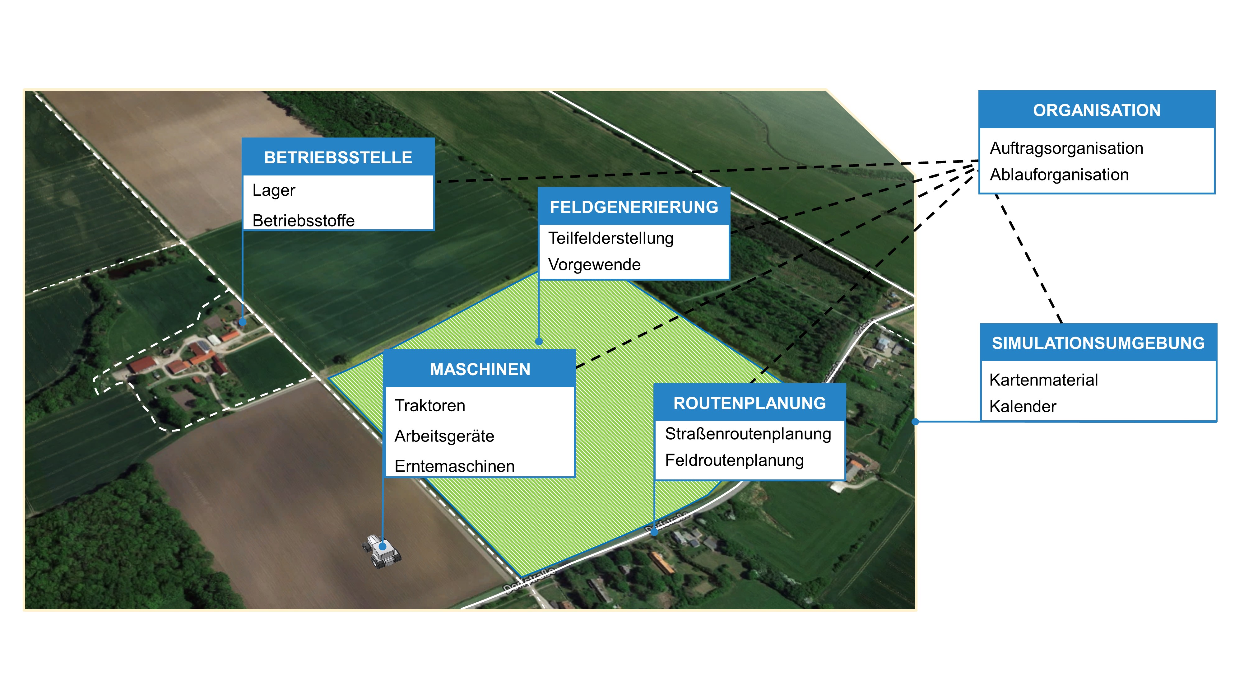 Die simulative Betrachtung erfolgt mithilfe einer am IMN entwickelten Methode zur Verfahrenssimulation. Die Abbildung der landwirtschaftlichen Prozesse geschieht in einem Verfahrensmodell und beruht auf einer agentenbasierten Simulation.