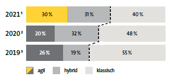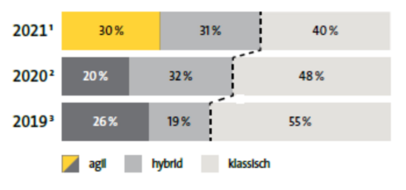 2021 geben 60 % an, in agilen oder hybriden Entwicklungssystemen zu arbeiten