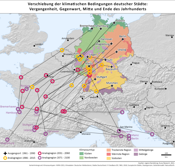 Der Klimawandel verschiebt deutsche Städte klimatisch Richtung Süd-Westen. Prognosen gehen davon aus, dass in den nächsten 30 Jahren bis zu 500 Kilometer möglich sind. Für die Entwicklung wirkungsvoller Gegenmaßnahmen spielen sogenannte Klimazwillinge eine wichtige Rolle.