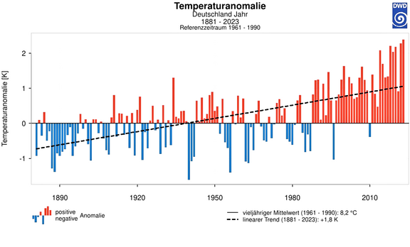 Nebeneiner ausreichenden Wassermenge spielt die Temperatur für die Landwirtschaft eine entscheidende Rolle. Seit den 1960er Jahren intensiviert die anthropogene Freisetzung von Kohlendioxid, Methan und Distickstoffoxid den natürlichen Treibhauseffekt. Mehr Wärmestrahlung wird in der Atmosphäre zurückgehalten, in den unteren Luftschichten steigt die Temperatur. Im Zeitraum von 1881 bis 2022 ist die Lufttemperatur im Flächenmittel von Deutschland um 1,7 Grad Celsius angestiegen und liegt damit sogar über dem globalen Jahresdurchschnitt.