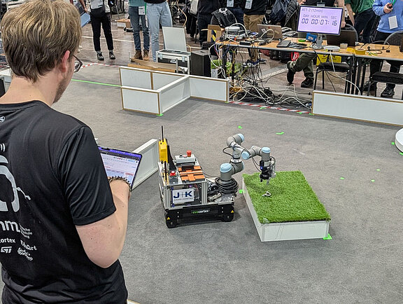 Tobias Kaupp: Der Wettbewerb ist so gestaltet, dass jeder Run zunehmend schwieriger wird. Um die Navigationsfähigkeiten zu testen, werden zusätzliche Hindernisse eingefügt, die der Roboter nicht in seiner vorher erstellten Karte hat. Objekterkennung wird dadurch erschwert, dass unbekannte Störobjekte eingefügt werden oder die Untergründe sich ändern, z.B. silbernes Bauteil auf einer reflektierenden Oberfläche. Dann kommt das Greifen von schrägen Tischen oder das Ablegen in industrieüblichen Plastikcontainer dazu. Schließlich gibt es fortgeschrittene Aufgaben wie das Greifen von einem Drehtisch oder das Ablegen in Aussparungen.