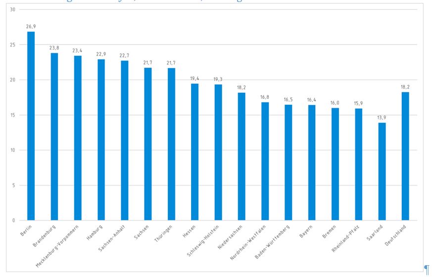 Neun Bundesländer liegen über diesem Schnitt, darunter sämtliche ostdeutschen Flächenländer und Berlin. Mit Hessen (19,4 Prozent) kommt das erste westdeutsche Flächenland erst auf Platz acht. Die südwest- und süddeutschen Bundesländer weisen hingegen einen zum Teil deutlichen Rückstand bei der Beschäftigung von Ingenieurinnen auf.
