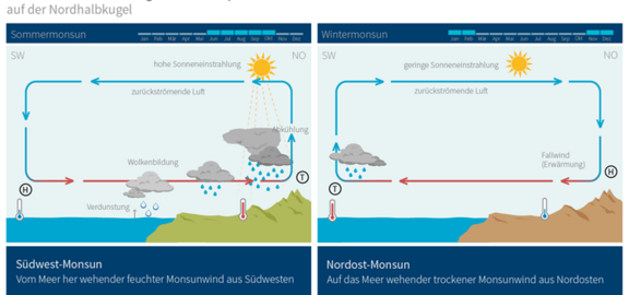 Das zweite regionale Kippelement ist der westafrikanische Monsun mit seinen Auswirkungen auf die Vegetation im Sahel. Der Monsun ist ein beständiger Wind, der zweimal im Jahr seine Richtung komplett ändert. Grund dafür sind Temperatur- und Luftdruckunterschiede zwischen Landmasse und Meer. In Monsungebieten gibt es nur zwei Jahreszeiten: eine Trockenzeit und eine Regenzeit. Im Sommer bringt der westafrikanische Monsun feuchte Luft aus Südwesten über das Meer ins Land, was zu zeitlich begrenzten, heftigen Regenfällen führt. Im Winter dagegen transportiert der Monsun trockene Luft aus Nordosten vom Land zum Meer. Geprägt vom Monsun als einziger Wasserquelle schwankt das Klima in kaum einer Region der Erde so stark wie im Sahel, einem mehrere hundert Kilometer breiten Gebiet zwischen der Sahara im Norden und den Savannen im Süden. Es erstreckt sich von der Atlantikküste Senegals bis nach Eritrea am Roten Meer.