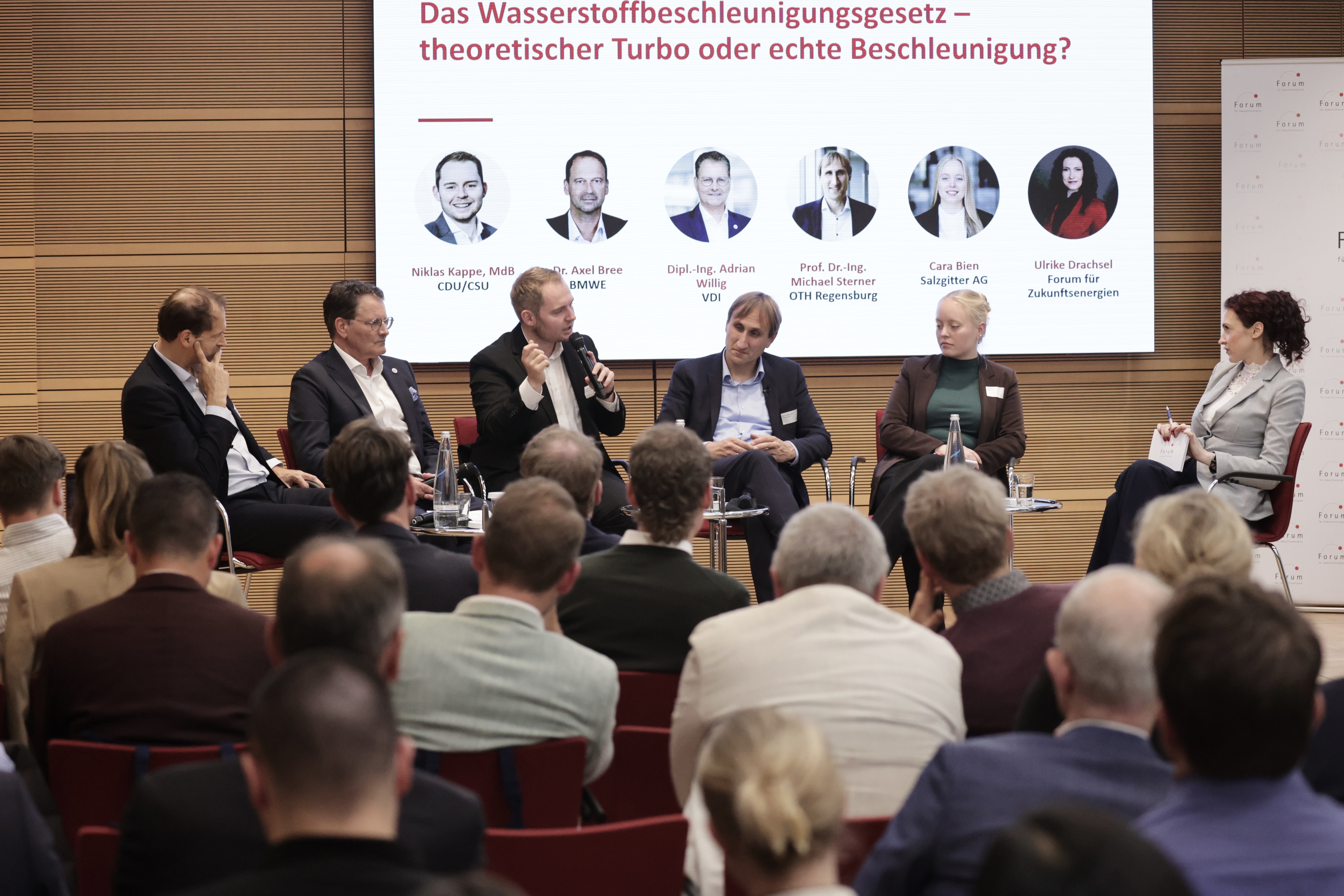 Herr Dr. Axel Bree aus dem Bundesenergie und -wirtschaftsministerium, der Bundestagsabgeordnete Niklas Kappe (CDU/CSU) sowie Cara Bien vom Stahlproduzenten Salzgitter diskutierten mit dem VDI und dem Forum für Zukunftsenergien gemeinsam über geeignete Maßnahmen, die zu einer Beschleunigung einer Wasserstoffwirtschaft führen können und darüber, was bereits auf den Weg gebracht wurde.