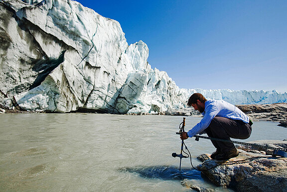 Grönland - altnordisch für Grünland - war zum letzten Mal vor rund 2,5 Millionen Jahren richtig grün. Heute sind rund 80 Prozent dieser größten Insel der Erde von einem dicken Eispanzer bedeckt, dem Grönland-Eisschild. Er ist teilweise über 3.000 Meter dick. Doch er war schon einmal dicker, denn steigende Temperaturen setzen dem Eisschild massiv zu: Durch das oberflächliche Abschmelzen bilden sich Seen, deren Wasser durch Gletscherspalten in die Tiefe bis auf den felsigen Untergrund der Insel gelangt. Die so entstehenden Flüsse unter dem Eis bewegen die Eismassen mit zunehmender Geschwindigkeit in Richtung Meer. Schon heute ist immer häufiger zu beobachten, dass meeresnahe Gletscherstücke abbrechen und zu Eisbergen zerfallen.