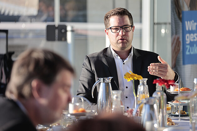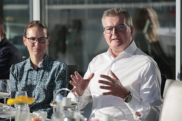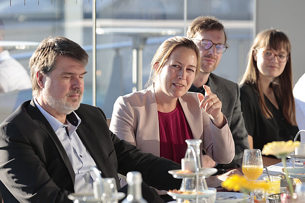 Zudem wurden am Tisch technische Innovationen als zentraler Bestandteil einer umfänglichen Transformation diskutiert. Sie bestimmen die Zukunft von Rezyklateinsatz bei der Produktherstellung und insbesondere Verwertung. Die Möglichkeiten des mechanischen und chemischen Recyclings wurden hierbei aus den unterschiedlichen Sichtweisen der Teilnehmenden beleuchtet und diskutiert.